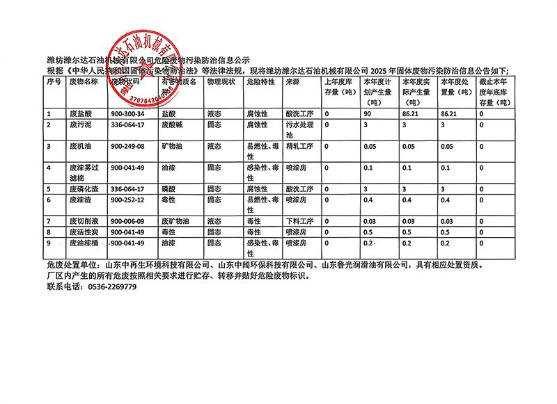 潍坊潍尔达石油机械有限公司危险废物污染防治信息公示